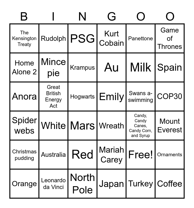 This bingo card has 37 words: Free!, Mariah Carey, Turkey, Home Alone 2, White, Swans a-swimming, Mince pie, Japan, Panettone, Orange, Spain, Kurt Cobain, Anora, Hogwarts, Game of Thrones, Emily, Australia, PSG, COP30, Great British Energy Act, The Kensington Treaty, Au, Mars, Candy, Candy Canes, Candy Corn, and Syrup, Leonardo da Vinci, Mount Everest, Rudolph, North Pole, Ornaments, Red, The Ghost of Christmas Yet To Come, Wreath, Milk, Christmas pudding, Spider webs, Krampus and Coffee.