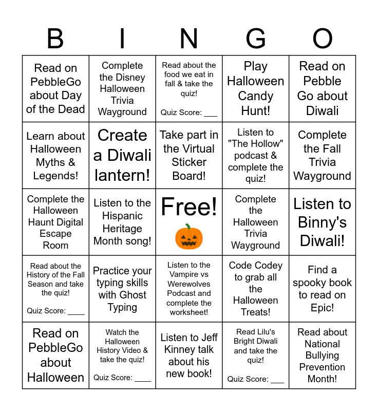 This bingo card has a free space and 24 words: Practice your typing skills with Ghost Typing, Watch the Halloween History Video & take the quiz! Quiz Score: ____, Take part in the Virtual Sticker Board!, Read on PebbleGo about Halloween, Read on Pebble Go about Diwali, Read on PebbleGo about Day of the Dead, Learn about Halloween Myths & Legends!, Complete the Disney Halloween Trivia Wayground, Complete the Halloween Trivia Wayground, Listen to the Vampire vs Werewolves Podcast and complete the worksheet!, Listen to "The Hollow" podcast & complete the quiz!, Complete the Halloween Haunt Digital Escape Room, Code Codey to grab all the Halloween Treats!, Find a spooky book to read on Epic!, Create a Diwali lantern!, Read Lilu's Bright Diwali and take the quiz! Quiz Score: ___, Listen to Binny's Diwali!, Read about the food we eat in fall & take the quiz! Quiz Score: ___, Complete the Fall Trivia Wayground, Listen to the Hispanic Heritage Month song!, Read about National Bullying Prevention Month!, Read about the History of the Fall Season and take the quiz! Quiz Score: ____, Play Halloween Candy Hunt! and Listen to Jeff Kinney talk about his new book!.