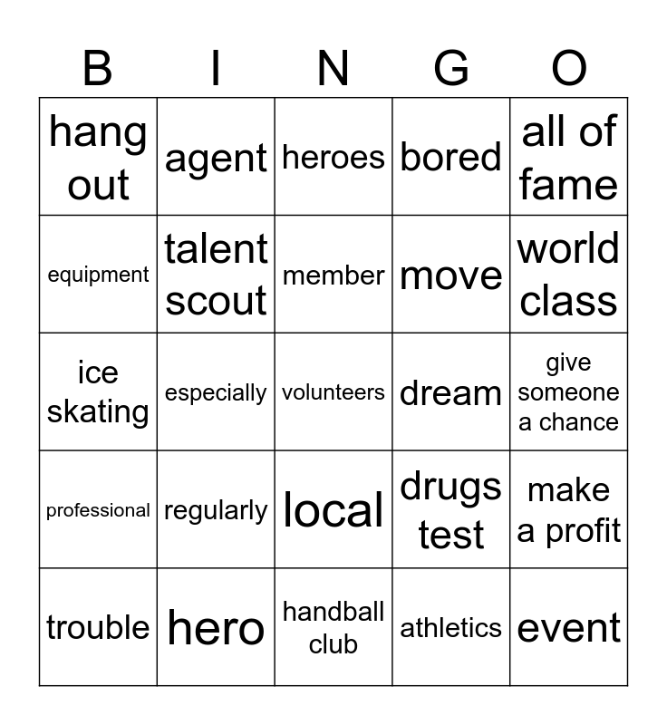 This bingo card has a free space and 24 words: regularly, hero, member, trouble, all of fame, hang out, equipment, agent, dream, local, move, ice skating, drugs test, make a profit, talent scout, athletics, give someone a chance, heroes, world class, especially, event, professional, bored and handball club.