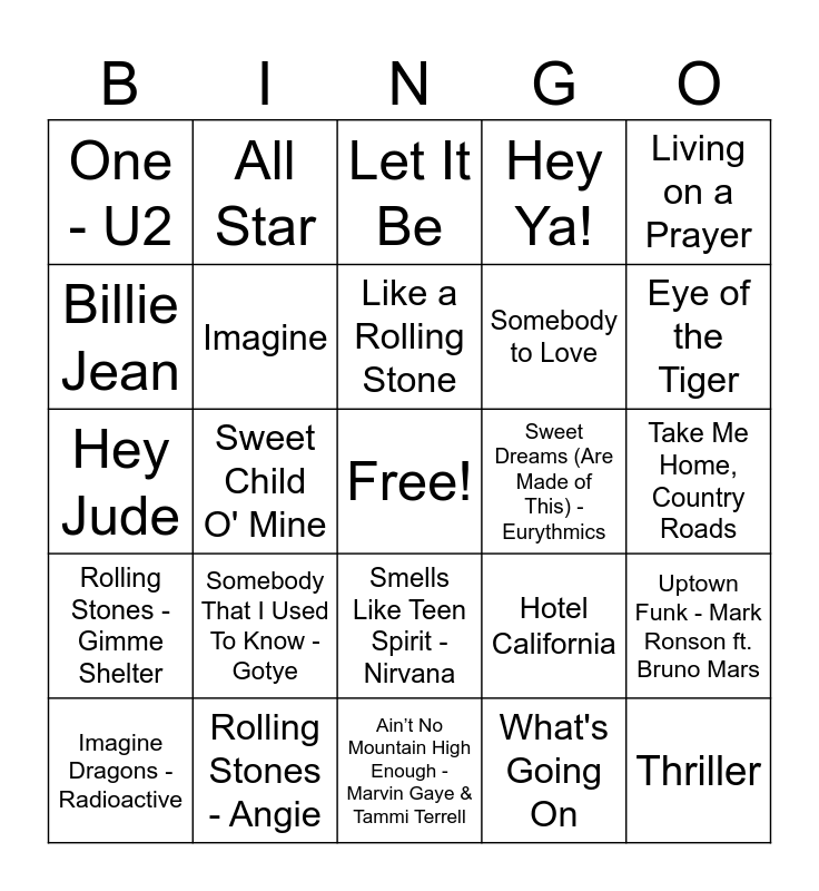 This bingo card has a free space and 75 words: Bohemian Rhapsody, Blinding Lights, Let It Be, Shape of You, Yesterday, Rolling in the Deep, Hallelujah, Uptown Funk, Bad Guy, Someone Like You, Wonderwall, Smells Like Teen Spirit, Like a Rolling Stone, Billie Jean, Take On Me, Sweet Child O' Mine, Lose Yourself, Thriller, I Will Always Love You, Living on a Prayer, Dancing Queen, Hey Jude, Imagine, All Star, Hey Ya!, Africa, No Scrubs, Creep, Rolling Stones - Paint It Black, Country Roads, Toxic, I Want to Hold Your Hand, Sweet Home Alabama, Hotel California, Eye of the Tiger, Somebody to Love, Superstition, Don't Stop Believin', Take Me Home, Country Roads, What's Going On, Respect, Bridge Over Troubled Water, Here Comes the Sun, We Will Rock You, Purple Rain, All Along the Watchtower, Imagine Dragons - Radioactive, One - U2, Black Hole Sun, Lose Yourself - Eminem, Shake It Off - Taylor Swift, Smells Like Teen Spirit - Nirvana, Billie Jean - Michael Jackson, Hallelujah - Leonard Cohen, Rolling Stones - Start Me Up, Jolene - Dolly Parton, Let Me Love You - Mario, Shallow - Lady Gaga & Bradley Cooper, In the End - Linkin Park, Back In Black - AC/DC, Somebody That I Used To Know - Gotye, I Want It That Way - Backstreet Boys, Girls Just Want to Have Fun - Cyndi Lauper, The Way You Make Me Feel - Michael Jackson, Let’s Dance - David Bowie, Sweet Dreams (Are Made of This) - Eurythmics, Don’t Stop Me Now - Queen, The Scientist - Coldplay, Call Me Maybe - Carly Rae Jepsen, Uptown Funk - Mark Ronson ft. Bruno Mars, Rolling Stones - Gimme Shelter, Rolling Stones - Angie, Somebody's Watching Me - Rockwell, Ain’t No Mountain High Enough - Marvin Gaye & Tammi Terrell and Wake Me Up Before You Go-Go - Wham!.