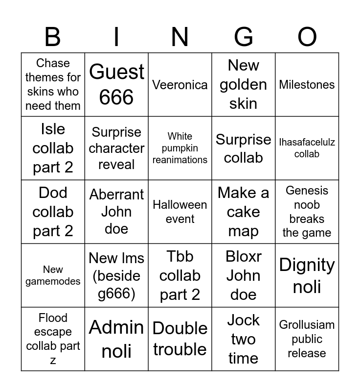 This bingo card has a free space and 24 words: New lms (beside g666), Admin noli, White pumpkin reanimations, Flood escape collab part z, Milestones, Chase themes for skins who need them, Isle collab part 2, Guest 666, Make a cake map, Tbb collab part 2, Surprise collab, Dod collab part 2, Bloxr John doe, Dignity noli, Surprise character reveal, Jock two time, Genesis noob breaks the game, Veeronica, Ihasafacelulz collab, Aberrant John doe, Grollusiam public release, New gamemodes, New golden skin and Double trouble.