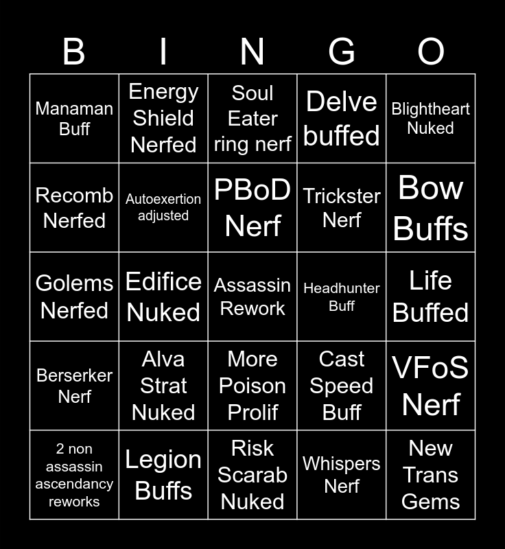 This bingo card has a free space and 24 words: Alva Strat Nuked, Legion Buffs, PBoD Nerf, 2 non assassin ascendancy reworks, Blightheart Nuked, Manaman Buff, Recomb Nerfed, Energy Shield Nerfed, Headhunter Buff, More Poison Prolif, Trickster Nerf, Golems Nerfed, Cast Speed Buff, VFoS Nerf, Autoexertion adjusted, Whispers Nerf, Life Buffed, Soul Eater ring nerf, Bow Buffs, Edifice Nuked, New Trans Gems, Berserker Nerf, Delve buffed and Risk Scarab Nuked.