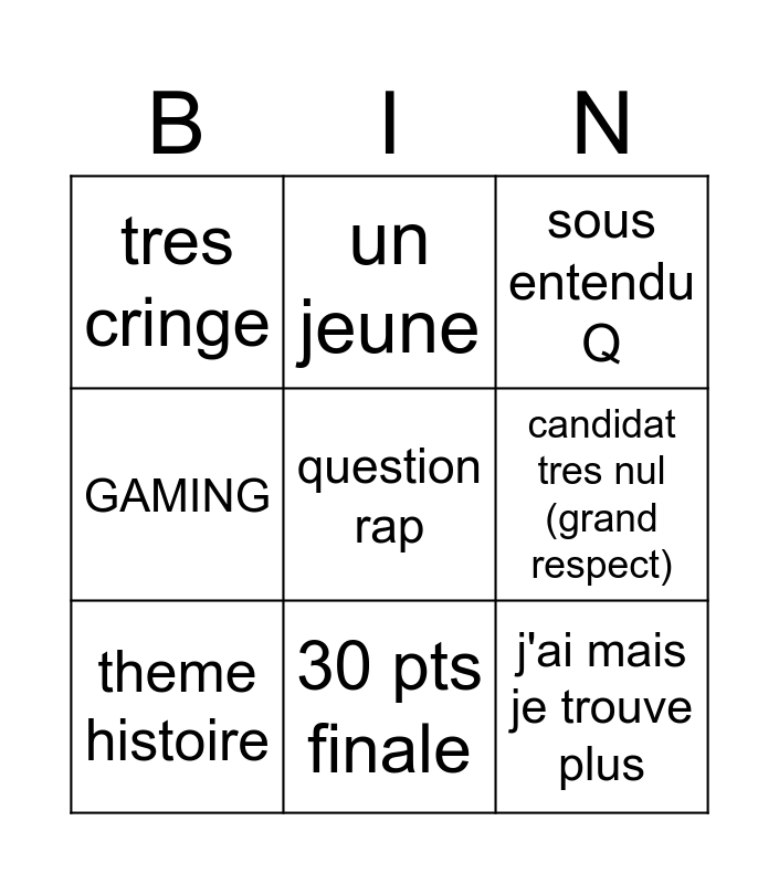 This bingo card has a free space and 8 words: candidat tres nul (grand respect), sous entendu Q, un jeune, theme histoire, tres cringe, j'ai mais je trouve plus, GAMING and 30 pts finale.