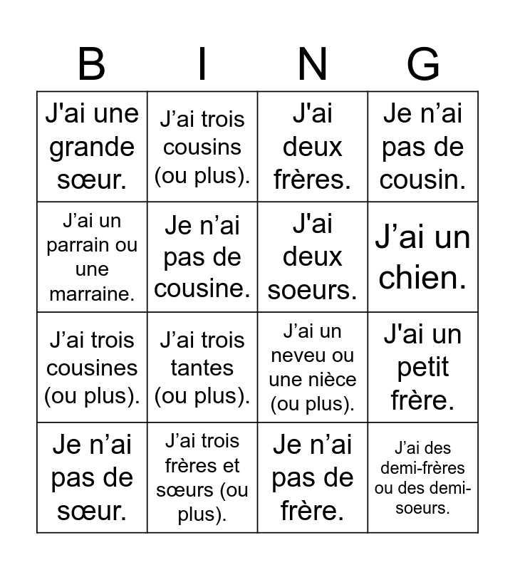 This bingo card has 31 words: Free!, J'ai un grand frère., J'ai un petit frère., J'ai une petite sœur., J'ai une grande sœur., J'ai deux frères., J'ai deux soeurs., J’ai un frère et une sœur., J’ai trois frères et sœurs (ou plus)., Je n’ai pas de frères ni de sœurs., Je n’ai pas de frère., Je n’ai pas de sœur., J’ai un ou deux oncles., J’ai trois oncles (ou plus)., J’ai trois tantes (ou plus)., J’ai une ou deux tantes., J’ai une belle-mère., J’ai un beau-père., J’ai des demi-frères ou des demi-soeurs., J’ai un beau-frère ou une belle-sœur (ou plus)., J’ai un parrain ou une marraine., J’ai un ou deux cousins., J’ai une ou deux cousines., J’ai trois cousins (ou plus)., J’ai trois cousines (ou plus)., Je n’ai pas de cousine., Je n’ai pas de cousin., J’ai un neveu ou une nièce (ou plus)., J’ai un chat., J’ai un chien. and J’ai un chat et un chien..