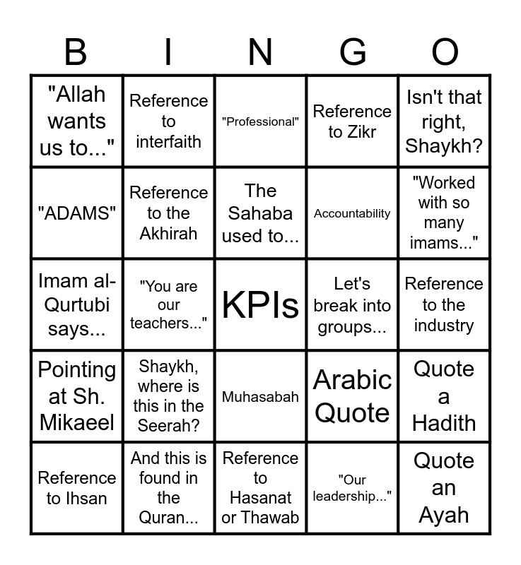 This bingo card has a free space and 24 words: Shaykh, where is this in the Seerah?, And this is found in the Quran..., The Sahaba used to..., Reference to Ihsan, Isn't that right, Shaykh?, "Allah wants us to...", "ADAMS", Reference to interfaith, Let's break into groups..., Muhasabah, Accountability, Imam al-Qurtubi says..., Arabic Quote, Quote a Hadith, Reference to the Akhirah, "Our leadership...", Reference to the industry, "Professional", "Worked with so many imams...", "You are our teachers...", Quote an Ayah, Pointing at Sh. Mikaeel, Reference to Zikr and Reference to Hasanat or Thawab.