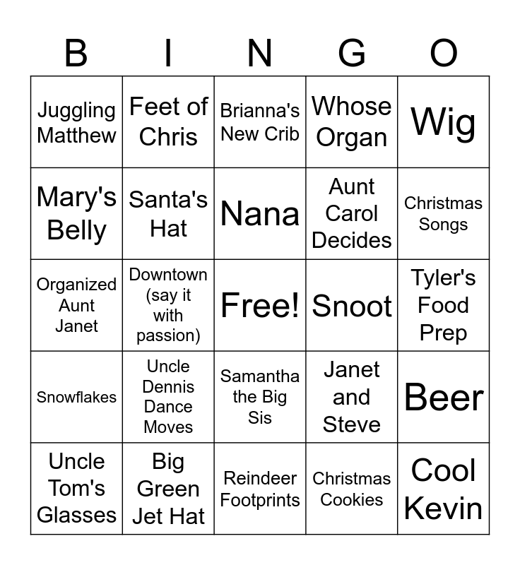 This bingo card has a free space and 24 words: Uncle Dennis Dance Moves, Big Green Jet Hat, Nana, Uncle Tom's Glasses, Wig, Juggling Matthew, Mary's Belly, Feet of Chris, Snoot, Samantha the Big Sis, Aunt Carol Decides, Organized Aunt Janet, Janet and Steve, Beer, Santa's Hat, Christmas Cookies, Tyler's Food Prep, Brianna's New Crib, Christmas Songs, Downtown (say it with passion), Cool Kevin, Snowflakes, Whose Organ and Reindeer Footprints.