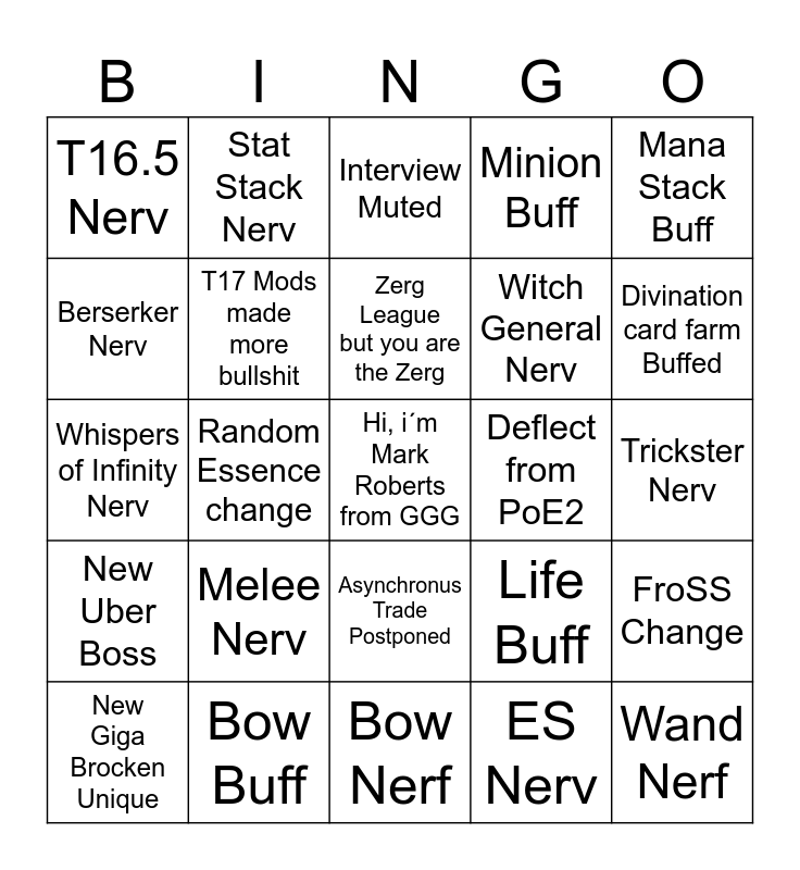 This bingo card has a free space and 34 words: Concoction Nerv, ES Nerv, QoL for the QoL, Asynchronus Trade Confirmed, New Uber Boss, T17 Mods made more bullshit, Mana Stack Buff, New Giga Brocken Unique, Stat Stack Nerv, Stream /Sound Dead, Zerg League but you are the Zerg, Interview Muted, Alva Nerv, New Npcs, Deflect from PoE2, Divination card farm Buffed, Bow Buff, Whispers of Infinity Nerv, Melee Nerv, Life Buff, Asynchronus Trade Postponed, Elementalist (Golem) Buff, T16.5 Nerv, Trickster Nerv, Bow Nerf, Wand Nerf, Minion Buff, Minion Nerf, Witch General Nerv, Berserker Nerv, Sabo/Assassin Buff, Random Essence change, FroSS Change and Catarina Change/Buff.