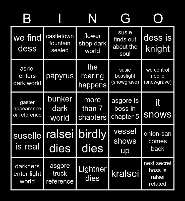 This bingo card has 25 words: ralsei dies, Lightner dies, the roaring happens, darkners enter light world, dess is knight, we find dess, asriel enters dark world, castletown fountain sealed, asgore is boss in chapter 5, birdly dies, susie bossfight (snowgrave), gaster appearance or reference, vessel shows up, onion-san comes back, papyrus, next secret boss is ralsei related, it snows, flower shop dark world, we control noelle (snowgrave), bunker dark world, more than 7 chapters, asgore truck reference, suselle is real, susie finds out about the soul and kralsei.
