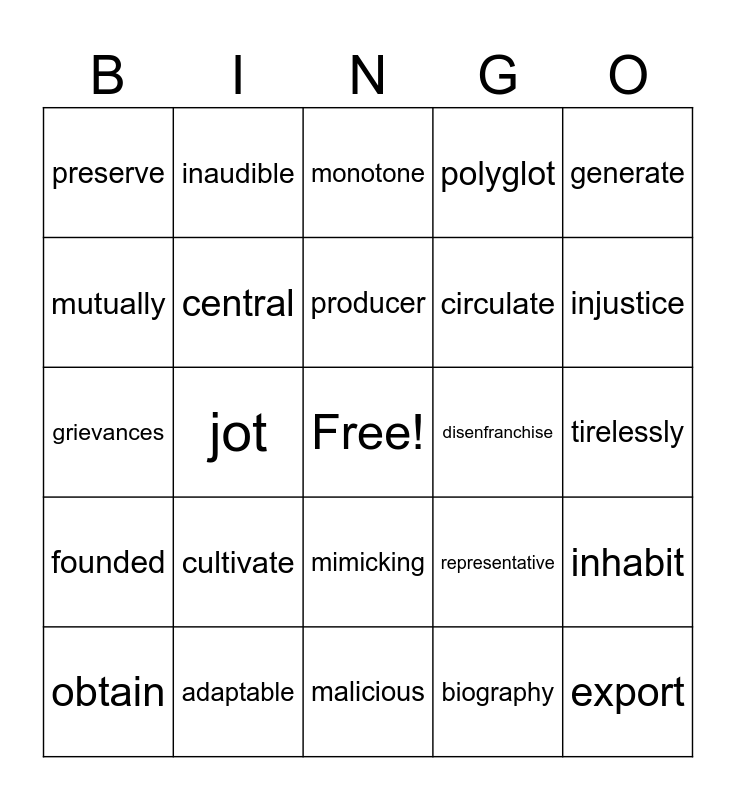 This bingo card has a free space and 24 words: cultivate, adaptable, producer, obtain, generate, preserve, mutually, inaudible, disenfranchise, mimicking, circulate, grievances, representative, inhabit, central, biography, tirelessly, monotone, injustice, jot, export, founded, polyglot and malicious.