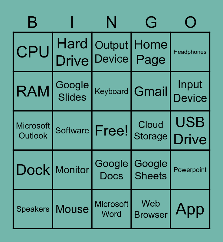 This bingo card has a free space and 24 words: Monitor, Mouse, Keyboard, Speakers, Headphones, CPU, RAM, Hard Drive, Cloud Storage, Google Docs, Gmail, Microsoft Outlook, Google Sheets, Powerpoint, Google Slides, Web Browser, USB Drive, Output Device, Input Device, Software, App, Dock, Home Page and Microsoft Word.
