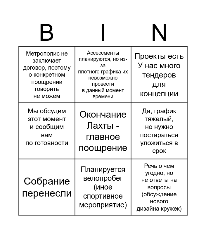 This bingo card has 9 words: Собрание перенесли, Проекты есть У нас много тендеров для концепции, Ассессменты планируются, но из-за плотного графика их невозможно провести в данный момент времени, Мы обсудим этот момент и сообщим вам по готовности, Метрополис не заключает договор, поэтому о конкретном поощрении говорить не можем, Да, график тяжелый, но нужно постараться уложиться в срок, Окончание Лахты - главное поощрение, Речь о чем угодно, но не ответы на вопросы (обсуждение нового дизайна кружек) and Планируется велопробег (иное спортивное мероприятие).