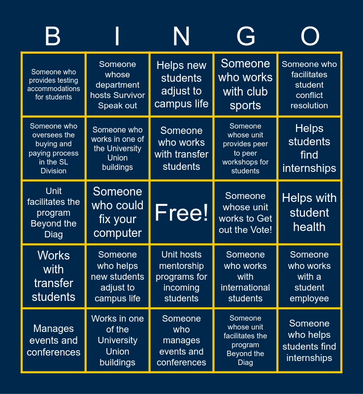 This bingo card has a free space and 51 words: Someone who works with student groups, Someone who helps students find internships, Someone who works to keep our campus clean and sustainable, Someone who manages events and conferences, Someone who helps new students adjust to campus life, Someone who promotes healthy and inclusive dining, Someone whose department hosts Survivor Speak out, Someone who trains other employees, Someone who oversees the buying and paying process in the SL Division, Someone who went to the University of Michigan, Someone who works in one of the University Union buildings, Someone who works with club sports, Someone who works with a student employee, Someone who works with international students, Someone whose unit provides mental health support to students, Someone who helps with student health, Someone who works with transfer students, Someone whose unit works to Get out the Vote!, Someone who works in/for the residence halls, Someone who facilitates student conflict resolution, Someone who could fix your computer, Someone whose unit facilitates the program Beyond the Diag, Someone who provides testing accommodations for students, Someone whose unit provides peer to peer workshops for students, Someone whose unit hosts mentorship programs for incoming students, Works with student groups, Helps students find internships, Works to keep our campus clean and sustainable, Manages events and conferences, Helps new students adjust to campus life, Promotes healthy and inclusive dining, Department hosts Survivor Speak out, Trains other employees, Oversees the buying and paying process in the SL Division, Went to the University of Michigan, Works in one of the University Union buildings, Works with club sports, Works with a student employee, Works with international students, Unit provides mental health support to students, Helps with student health, Works with transfer students, Unit works to Get out the Vote!, Works in/for the residence halls, Facilitates student conflict resolution, Could fix your computer, Unit facilitates the program Beyond the Diag, Provides testing accommodations for students, Unit provides peer to peer workshops for students, Unit hosts mentorship programs for incoming students and Unit contains the Center for Campus Involvement.