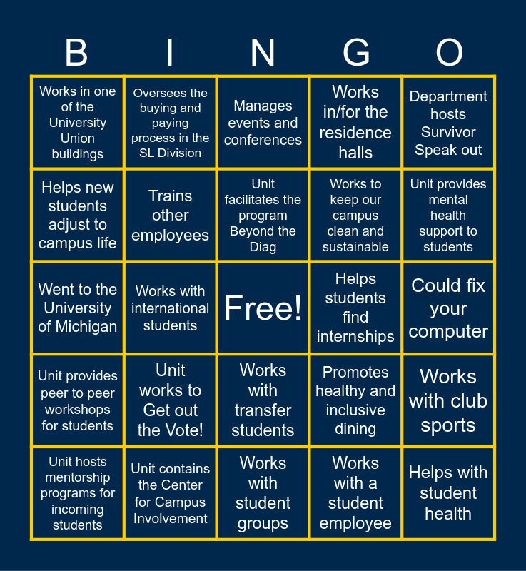 This bingo card has a free space and 26 words: Works with transfer students, Works with a student employee, Unit facilitates the program Beyond the Diag, Unit contains the Center for Campus Involvement, Department hosts Survivor Speak out, Works in one of the University Union buildings, Helps new students adjust to campus life, Oversees the buying and paying process in the SL Division, Could fix your computer, Promotes healthy and inclusive dining, Works to keep our campus clean and sustainable, Went to the University of Michigan, Works with club sports, Unit hosts mentorship programs for incoming students, Works with international students, Facilitates student conflict resolution, Works in/for the residence halls, Unit provides peer to peer workshops for students, Manages events and conferences, Helps with student health, Unit provides mental health support to students, Works with student groups, Helps students find internships, Unit works to Get out the Vote!, Trains other employees and Provides testing accommodations for students.