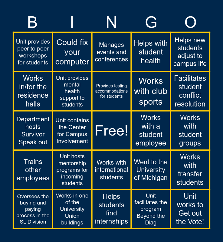 This bingo card has a free space and 26 words: Works with international students, Unit facilitates the program Beyond the Diag, Provides testing accommodations for students, Works in one of the University Union buildings, Helps new students adjust to campus life, Unit provides peer to peer workshops for students, Works in/for the residence halls, Could fix your computer, Works with student groups, Went to the University of Michigan, Works with club sports, Department hosts Survivor Speak out, Works with transfer students, Oversees the buying and paying process in the SL Division, Unit contains the Center for Campus Involvement, Promotes healthy and inclusive dining, Helps with student health, Trains other employees, Manages events and conferences, Unit works to Get out the Vote!, Facilitates student conflict resolution, Helps students find internships, Works with a student employee, Unit hosts mentorship programs for incoming students, Unit provides mental health support to students and Works to keep our campus clean and sustainable.