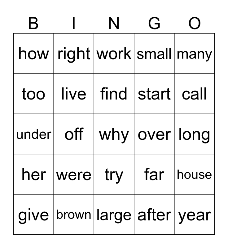 This bingo card has a free space and 24 words: were, brown, find, give, many, how, too, right, over, try, start, under, far, house, live, after, long, work, call, off, year, her, small and large.