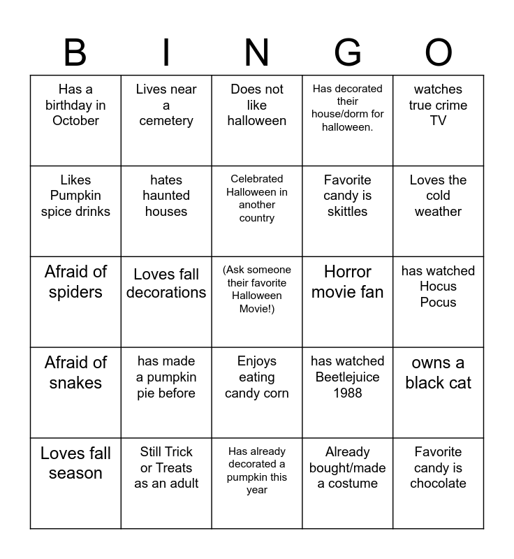 This bingo card has a free space and 24 words: Loves fall season, has made a pumpkin pie before, Celebrated Halloween in another country, Already bought/made a costume, watches true crime TV, Has a birthday in October, Lives near a cemetery, Does not like halloween, Horror movie fan, has watched Hocus Pocus, Afraid of spiders, hates haunted houses, has watched Beetlejuice 1988, owns a black cat, Likes Pumpkin spice drinks, Still Trick or Treats as an adult, Has already decorated a pumpkin this year, Has decorated their house/dorm for halloween., Loves the cold weather, Afraid of snakes, Loves fall decorations, Enjoys eating candy corn, Favorite candy is skittles and Favorite candy is chocolate.