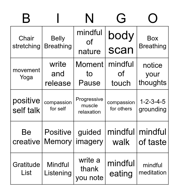 This bingo card has a free space and 24 words: Positive Memory, Mindful Listening, Moment to Pause, Gratitude List, Box Breathing, Chair stretching, movement Yoga, Belly Breathing, compassion for others, guided imagery, mindful of touch, positive self talk, mindful walk, mindful of taste, write and release, mindful eating, 1-2-3-4-5 grounding, mindful of nature, notice your thoughts, compassion for self, mindful meditation, Be creative, body scan and write a thank you note.