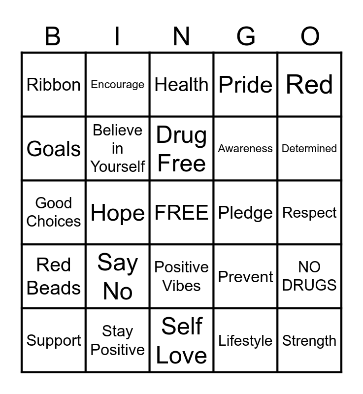 This bingo card has a free space and 24 words: Say No, Stay Positive, Drug Free, Support, Red, Ribbon, Goals, Encourage, Pledge, Positive Vibes, Awareness, Good Choices, Prevent, NO DRUGS, Believe in Yourself, Lifestyle, Respect, Health, Determined, Hope, Strength, Red Beads, Pride and Self Love.
