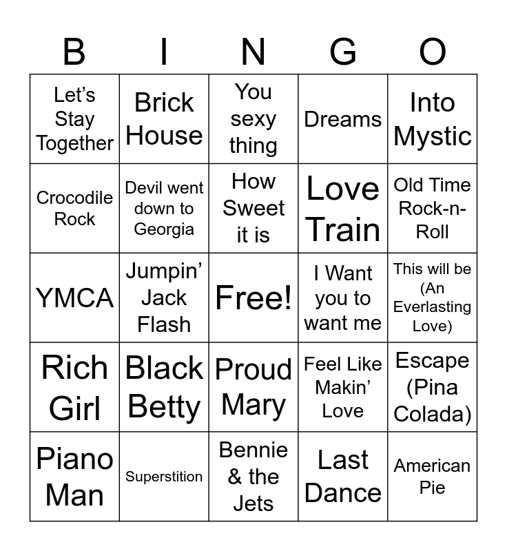 This bingo card has a free space and 49 words: American Girl, American Pie, Beast of Burden, Bennie & the Jets, Black Betty, Bohemian Rhapsody, Brick House, Cecilia, Crocodile Rock, Dancing Queen, Devil went down to Georgia, Dreams, Escape (Pina Colada), Feel Like Makin’ Love, Free Bird, Hooked on a Feeling, How Sweet it is, I Want you to want me, I Was Made for Lovin’ You, Into Mystic, Jumpin’ Jack Flash, Last Dance, Let’s Stay Together, Love Train, More than a Feeling, Old Time Rock-n-Roll, Piano Man, Play that Funky Music, Proud Mary, Rich Girl, Rock the Boat, September, Signed, Sealed, Delivered, Simple Man, Superstition, Sweet Home Alabama, The Joker, The Logical Song, This will be (An Everlasting Love), Tiny Dancer, Walk This Way, We are Family, We’re an American Band, Wonderful Tonight, YMCA, You sexy thing, You’re my best friend, You’re the one that I want and Your Song.