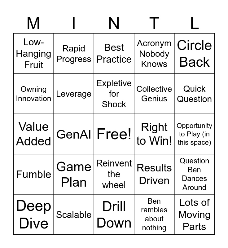 This bingo card has a free space and 29 words: Deep Dive, Hit the ground running, GenAI, Action Item, Low-Hanging Fruit, Best Practice, Leverage, Game Plan, Right to Win!, Scalable, Opportunity to Play (in this space), Lots of Moving Parts, Drill Down, Ben rambles about nothing, Quick Question, Predictive (noun), Reinvent the wheel, Fumble, Circle Back, Value Added, Results Driven, "In the industry", Collective Genius, Owning Innovation, Acronym Nobody Knows, Rapid Progress, Question Ben Dances Around, Expletive for Shock and Speaker Ignorant of Mintel.