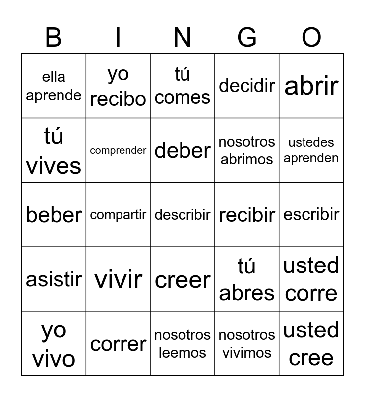 This bingo card has 41 words: aprender, beber, comer, comprender, correr, creer, deber, leer, abrir, asistir, compartir, decidir, describir, escribir, recibir, vivir, yo aprendo, ella aprende, tú bebes, tú comes, usted corre, usted cree, nosotros leemos, nosotros abrimos, ellos comparten, ellas escriben, nosotros vivimos, nosotras comemos, ustedes aprenden, ustedes comprenden, yo decido, yo recibo, yo vivo, tú corres, tú abres, tú vives, ella escribe, ella debe, ella aprende, nosotros compartimos and nosotros leemos.