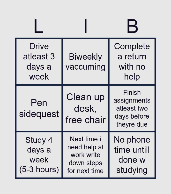 This bingo card has 9 words: Study 4 days a week (5-3 hours), Complete a return with no help, Biweekly vaccuming, Pen sidequest, Drive atleast 3 days a week, Finish assignments atleast two days before theyre due, Clean up desk, free chair, No phone time untill done w studying and Next time i need help at work write down steps for next time.