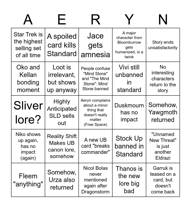 This bingo card has a free space and 24 words: Reality Shift Makes UB canon lore, somehow, Somehow, Urza also returned, People confuse "Mind Stone" and "The Mind Stone": Mind Stone banned, Fleem "anything", Story ends unsatisfactorily, Star Trek is the highest selling set of all time, Oko and Kellan bonding moment, A spoiled card kills Standard, Duskmourn has no impact, A new UB card "breaks commander", Vivi still unbanned in standard, Sliver lore?, Stock Up banned in Standard, "Unnamed New Threat" is just another Eldrazi, Loot is irrelevant, but shows up anyway, Thanos is the new lore big bad, Somehow, Yawgmoth returned, Jace gets amnesia, No interesting characters return to the story, Highly Anticipated SLD sells out, Garruk is teased on a card, but doesn't come back, Niko shows up again, has no impact (again), A major character from Bloomburrow gets humanized, is a twink and Nicol Bolas never mentioned again after Dragonstorm.