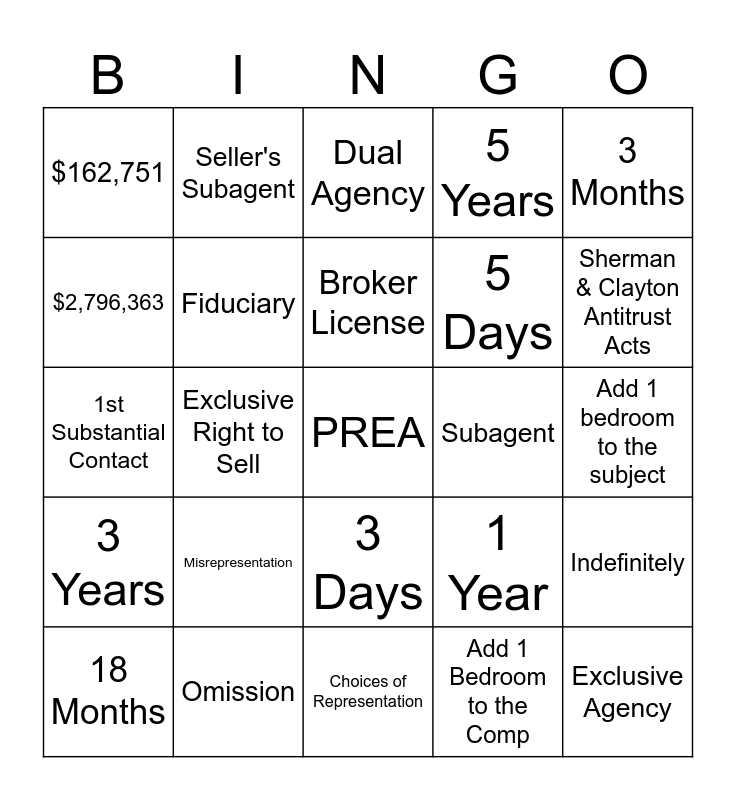 This bingo card has a free space and 24 words: Misrepresentation, Omission, Broker License, 18 Months, 3 Months, $162,751, $2,796,363, Seller's Subagent, Subagent, 3 Days, 5 Days, 1st Substantial Contact, 1 Year, Indefinitely, Fiduciary, Add 1 Bedroom to the Comp, Add 1 bedroom to the subject, Dual Agency, Sherman & Clayton Antitrust Acts, Exclusive Right to Sell, Exclusive Agency, 3 Years, 5 Years and Choices of Representation.