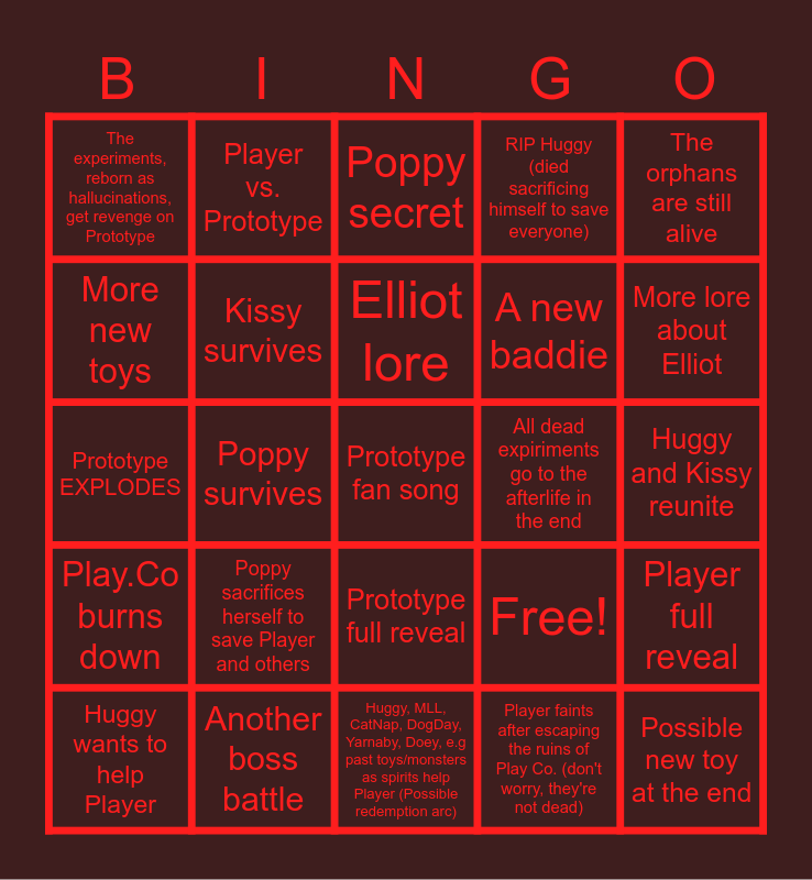 This bingo card has 25 words: Poppy sacrifices herself to save Player and others, Huggy, MLL, CatNap, DogDay, Yarnaby, Doey, e.g past toys/monsters as spirits help Player (Possible redemption arc), Elliot lore, Huggy wants to help Player, The orphans are still alive, The experiments, reborn as hallucinations, get revenge on Prototype, More new toys, Player vs. Prototype, All dead expiriments go to the afterlife in the end, Prototype full reveal, A new baddie, Prototype EXPLODES, Free!, Player full reveal, Kissy survives, Possible new toy at the end, Huggy and Kissy reunite, Poppy secret, More lore about Elliot, Poppy survives, Prototype fan song, Another boss battle, Play.Co burns down, RIP Huggy (died sacrificing himself to save everyone) and Player faints after escaping the ruins of Play Co. (don't worry, they're not dead).
