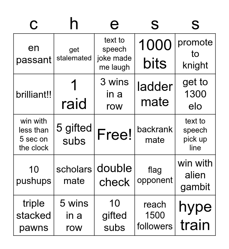This bingo card has a free space and 24 words: scholars mate, 5 wins in a row, 3 wins in a row, triple stacked pawns, promote to knight, en passant, brilliant!!, get stalemated, backrank mate, double check, ladder mate, win with less than 5 sec on the clock, flag opponent, win with alien gambit, 1 raid, reach 1500 followers, text to speech pick up line, text to speech joke made me laugh, get to 1300 elo, 5 gifted subs, hype train, 10 pushups, 1000 bits and 10 gifted subs.