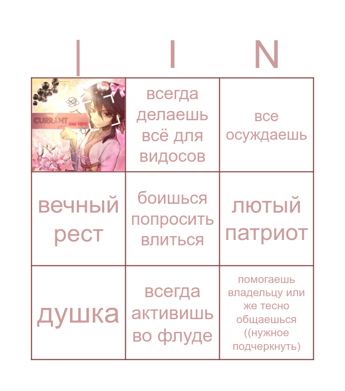 This bingo card has 1 images and 8 words: душка, все осуждаешь, всегда делаешь всё для видосов, вечный рест, лютый патриот, боишься попросить влиться, помогаешь владельцу или же тесно общаешься ((нужное подчеркнуть) and всегда активишь во флуде.