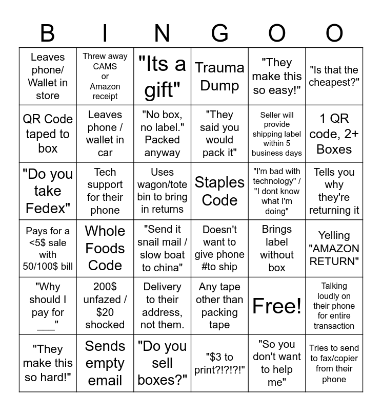 This bingo card has 37 words: Free!, Any tape other than packing tape, "So you don't want to help me", QR Code taped to box, Whole Foods Code, "I'm bad with technology" / "I dont know what I'm doing", Leaves phone / wallet in car, "$3 to print?!?!?!", "They make this so easy!", "They make this so hard!", 1 QR code, 2+ Boxes, Trauma Dump, "Do you take Fedex", Uses wagon/tote bin to bring in returns, "Is that the cheapest?", Staples Code, 200$ unfazed / $20 shocked, "Its a gift", Tells you why they're returning it, Tech support for their phone, Leaves phone/ Wallet in store, "They said you would pack it", "Send it snail mail / slow boat to china", Brings label without box, Sends empty email, Yelling "AMAZON RETURN", Threw away CAMS or Amazon receipt, "Do you sell boxes?", Talking loudly on their phone for entire transaction, Delivery to their address, not them., Green / blue return that is larger than 18cu, Doesn't want to give phone #to ship, Seller will provide shipping label within 5 business days, "Why should I pay for ___", Pays for a <5$ sale with 50/100$ bill, "No box, no label." Packed anyway and Tries to send to fax/copier from their phone.