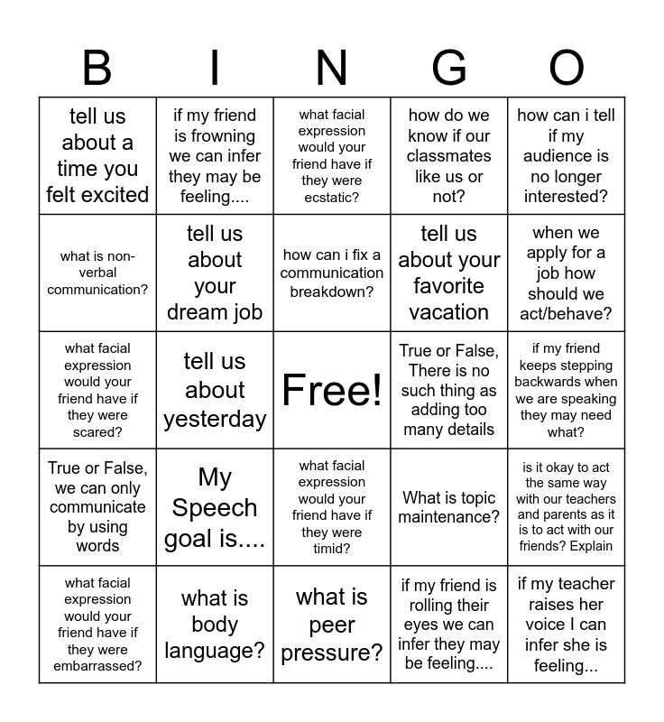 This bingo card has a free space and 24 words: My Speech goal is...., what is body language?, how can i fix a communication breakdown?, what facial expression would your friend have if they were embarrassed?, how can i tell if my audience is no longer interested?, tell us about a time you felt excited, what is non-verbal communication?, if my friend is frowning we can infer they may be feeling...., True or False, There is no such thing as adding too many details, what facial expression would your friend have if they were timid?, tell us about your favorite vacation, what facial expression would your friend have if they were scared?, What is topic maintenance?, is it okay to act the same way with our teachers and parents as it is to act with our friends? Explain, tell us about your dream job, if my friend is rolling their eyes we can infer they may be feeling...., if my friend keeps stepping backwards when we are speaking they may need what?, what facial expression would your friend have if they were ecstatic?, when we apply for a job how should we act/behave?, tell us about yesterday, if my teacher raises her voice I can infer she is feeling..., True or False, we can only communicate by using words, how do we know if our classmates like us or not? and what is peer pressure?.