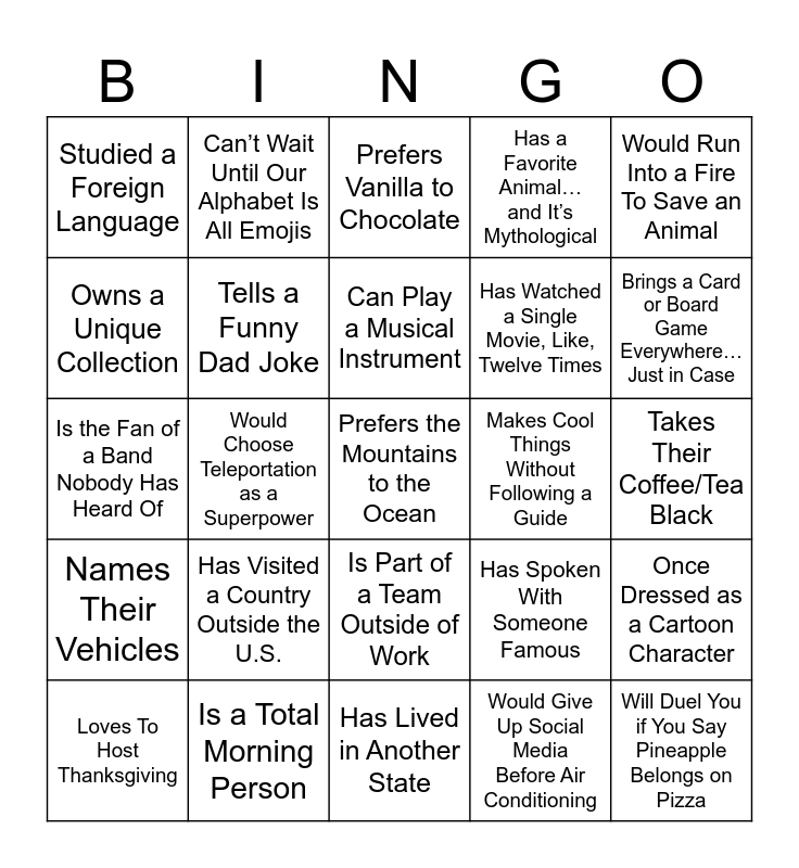This bingo card has 25 words: Has Visited a Country Outside the U.S., Has Lived in Another State, Can Play a Musical Instrument, Loves To Host Thanksgiving, Would Run Into a Fire To Save an Animal, Studied a Foreign Language, Owns a Unique Collection, Can’t Wait Until Our Alphabet Is All Emojis, Makes Cool Things Without Following a Guide, Is Part of a Team Outside of Work, Has Watched a Single Movie, Like, Twelve Times, Is the Fan of a Band Nobody Has Heard Of, Has Spoken With Someone Famous, Once Dressed as a Cartoon Character, Tells a Funny Dad Joke, Will Duel You if You Say Pineapple Belongs on Pizza, Takes Their Coffee/Tea Black, Prefers Vanilla to Chocolate, Brings a Card or Board Game Everywhere… Just in Case, Would Choose Teleportation as a Superpower, Prefers the Mountains to the Ocean, Is a Total Morning Person, Names Their Vehicles, Has a Favorite Animal… and It’s Mythological and Would Give Up Social Media Before Air Conditioning.