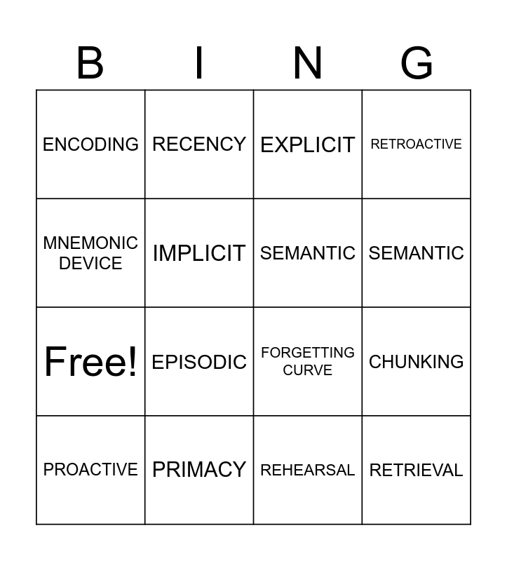 This bingo card has 20 words: CHUNKING, REPRESSION, EXPLICIT, PROCEDURAL, PROACTIVE, MNEMONIC DEVICE, PRIMACY, ENCODING, Free!, RECENCY, EPISODIC, FORGETTING CURVE, IMPLICIT, RETRIEVAL, SEMANTIC, RETRIEVAL, SEMANTIC, RETROACTIVE, REHEARSAL and PROSPECTIVE.