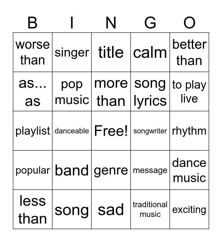 This bingo card has a free space and 24 words: band, song, more than, less than, better than, worse than, as... as, singer, songwriter, genre, song lyrics, playlist, message, dance music, pop music, traditional music, rhythm, title, to play live, danceable, exciting, popular, calm and sad.