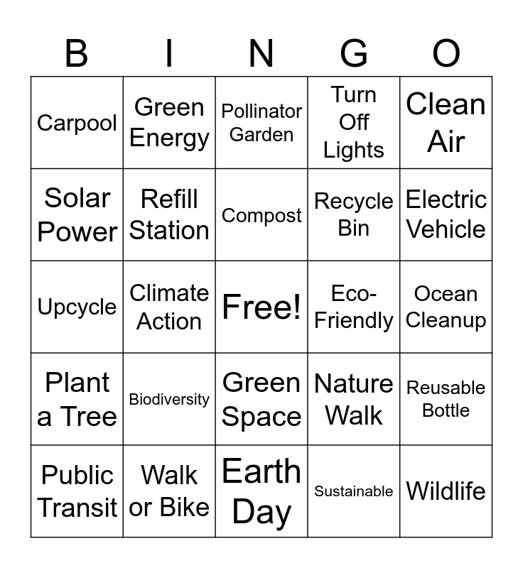 This bingo card has a free space and 29 words: Public Transit, Zero Waste, Climate Action, Conservation, Carpool, Pollinator Garden, Refill Station, Biodiversity, Eco-Friendly, Walk or Bike, Ocean Cleanup, Wildlife, Earth Day, Sustainable, Electric Vehicle, Local Food, Green Space, Plant a Tree, Clean Air, Upcycle, Nature Walk, Thrifted, Recycle Bin, Solar Power, Turn Off Lights, Green Energy, Reusable Bottle, Compost and RRR.
