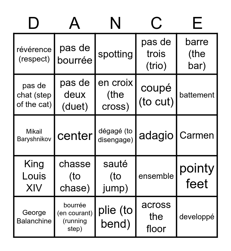 This bingo card has 50 words: tendu (to stretch), dégagé (to disengage), releve (to rise), plie (to bend), chasse (to chase), tombe (to fall), pas de bourrée, glissade (to glide), pas de chat (step of the cat), turnout, pas de deux (duet), pas de trois (trio), pointy feet, ensemble, assemblé (to assemble), pirouette (turn), en croix (the cross), adagio, allegro, barre (the bar), center, across the floor, révérence (respect), coupé (to cut), passé, developpé, battement, balancé, spotting, sauté (to jump), chainé, piqué, jeté (to throw), sous-sus (under over), bourrée (en courant) (running step), arabesque, corps de ballet, soloist, principal, Carmen, Swan Lake, The Nutcracker, Giselle, Misty Copeland, George Balanchine, Mikail Baryshnikov, Margo Fonteyn, Yuanyuan Tan, King Louis XIV and pointe shoe.