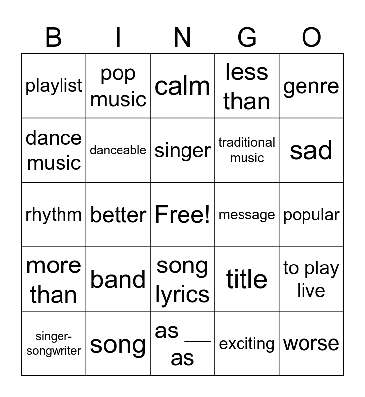This bingo card has a free space and 24 words: band, song, singer, singer-songwriter, genre, playlist, dance music, pop music, message, song lyrics, traditional music, rhythm, title, to play live, danceable, exciting, popular, calm, sad, better, worse, more than, less than and as __ as.