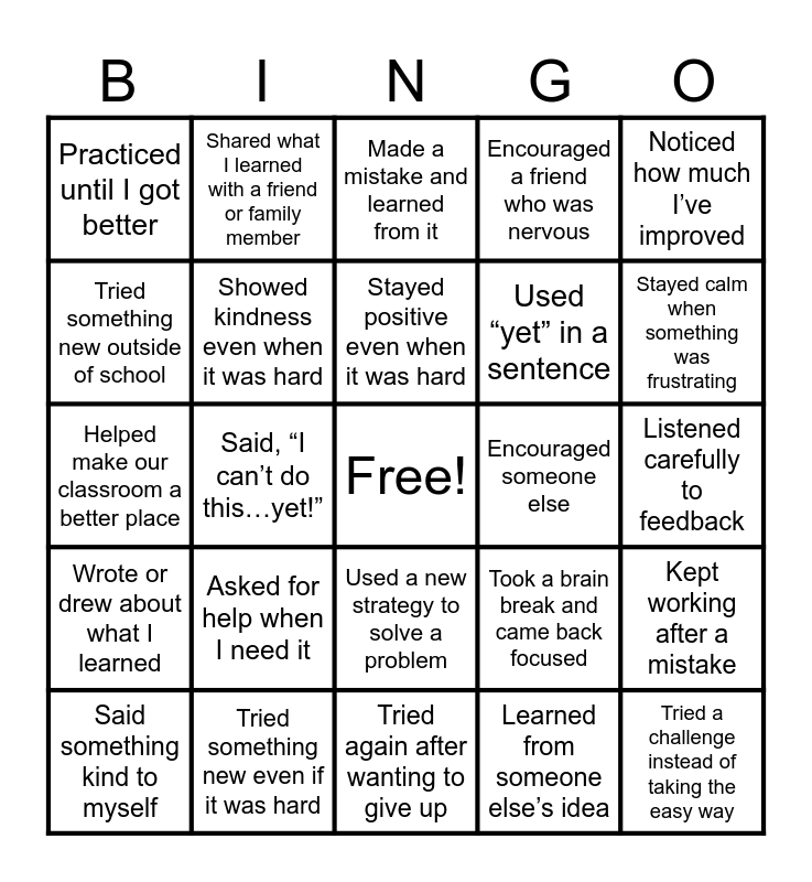 This bingo card has a free space and 30 words: Tried something new even if it was hard, Helped a classmate who was struggling, Said, “I can’t do this…yet!”, Asked a question to learn more, Practiced until I got better, Made a mistake and learned from it, Showed kindness even when it was hard, Used a new strategy to solve a problem, Encouraged someone else, Tried again after wanting to give up, Listened carefully to feedback, Tried a challenge instead of taking the easy way, Learned from someone else’s idea, Used positive self-talk, Stayed calm when something was frustrating, Worked hard on something I care about, Took a brain break and came back focused, Wrote or drew about what I learned, Asked for help when I need it, Noticed how much I’ve improved, Helped make our classroom a better place, Tried to solve a problem before asking an adult, Shared what I learned with a friend or family member, Used “yet” in a sentence, Tried something new outside of school, Encouraged a friend who was nervous, Kept working after a mistake, Said something kind to myself, Stayed positive even when it was hard and Learned from feedback.