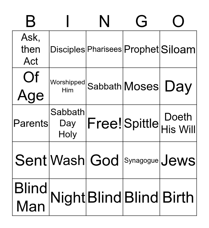 This bingo card has a free space and 24 words: Wash, Night, Sabbath, Blind Man, Siloam, Ask, then Act, Of Age, Disciples, Spittle, God, Moses, Parents, Synagogue, Jews, Worshipped Him, Blind, Doeth His Will, Pharisees, Day, Sabbath Day Holy, Birth, Sent, Prophet and Blind.