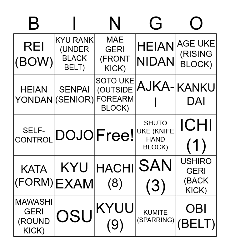 This bingo card has a free space and 60 words: KARATE, OSU, KIHON (BASICS), KATA (FORM), KUMITE (SPARRING), SENSEI (TEACHER), SENPAI (SENIOR), SHOTOKAN, AJKA-I, HEIAN SHODAN, HEIAN NIDAN, HEIAN SANDAN, HEIAN YONDAN, HEIAN GODAN, SEIZA (SIT), REI (BOW), OBI (BELT), AGE UKE (RISING BLOCK), GEDAN BARAI (DOWN BLOCK), SOTO UKE (OUTSIDE FOREARM BLOCK), SHUTO UKE (KNIFE HAND BLOCK), MAE GERI (FRONT KICK), MAWASHI GERI (ROUND KICK), USHIRO GERI (BACK KICK), KOHAI (JUNIOR), TAIKYOKU SHODAN, TEKKI SHODAN, BASSAI DAI, KANKU DAI, ENPI, JION, YOI (READY), YAME (STOP), MOKUSO (EYES CLOSED), KYU RANK (UNDER BLACK BELT), DAN RANK (BLACK BELTS), HUNG, DOJO, COURTESY, SELF-CONTROL, RIVERSIDE SHOTOKAN KARATE, KYU EXAM, ICHI (1), NI (2), SAN (3), SHI (4), GO (5), ROKU (6), SHICHI (7), HACHI (8), KYUU (9), JYUU (10), CHARACTER, FRONT STANCE, BACK STANCE, SIDE STANCE, NATURAL STANCE, SINCERITY, DOJO KUN and EFFORT.