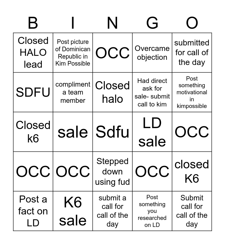 This bingo card has 25 words: OCC, K6 sale, Sdfu, Post something you researched on LD, submitted for call of the day, Closed HALO lead, Post picture of Dominican Republic in Kim Possible, OCC, LD sale, closed K6, SDFU, compliment a team member, submit a call for call of the day, OCC, Post something motivational in kimpossible, Post a fact on LD, sale, Closed halo, Had direct ask for sale- submit call to kim, OCC, Closed k6, OCC, Stepped down using fud, Overcame objection and Submit call for call of the day.