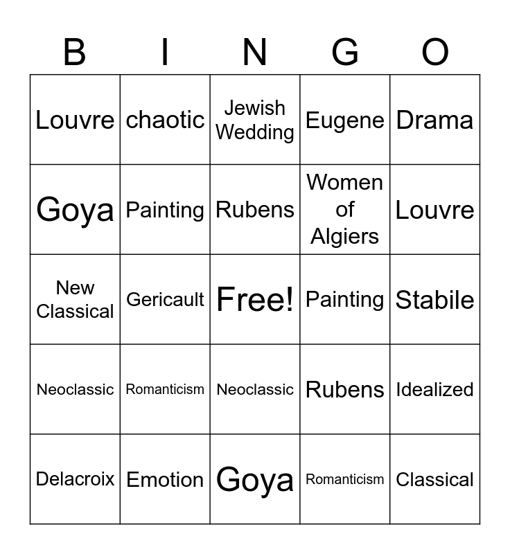 This bingo card has a free space and 24 words: Romanticism, Emotion, Rubens, Delacroix, Drama, Louvre, Goya, chaotic, Painting, Neoclassic, Women of Algiers, New Classical, Rubens, Idealized, Painting, Romanticism, Stabile, Jewish Wedding, Louvre, Gericault, Classical, Neoclassic, Eugene and Goya.