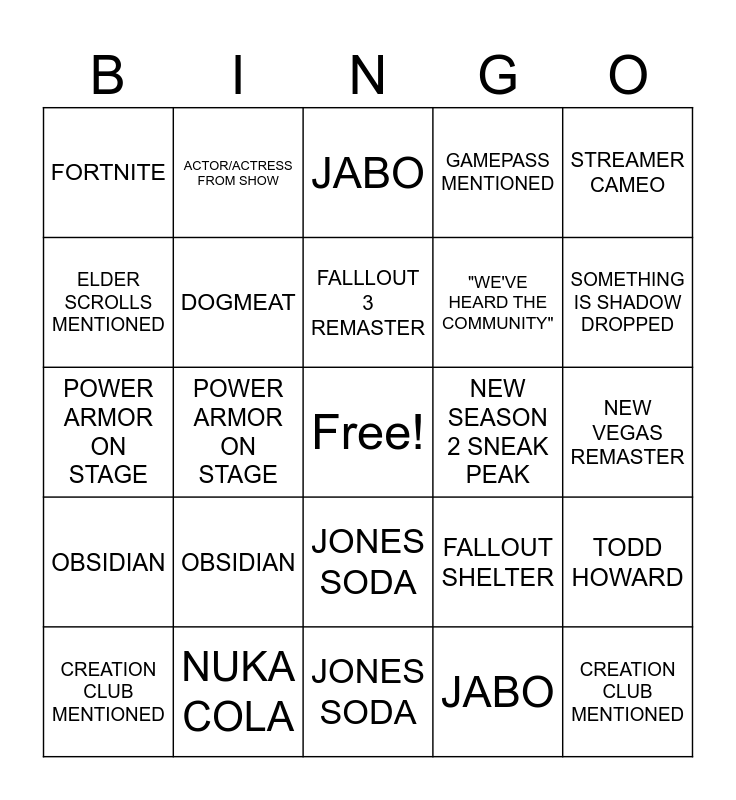 ⚠ This card has duplicate items: SOMETHING IS SHADOW DROPPED (2), CREATION CLUB MENTIONED (2), FALLOUT 4 UPDATE (2), JONES SODA (2), OBSIDIAN (2), FALLOUT 76 DLC (2), ACTOR/ACTRESS FROM SHOW (2), TIM CAIN (2), ELDER SCROLLS MENTIONED (2), NUKA COLA (2), DOGMEAT (2), GAMEPASS MENTIONED (2), FALLOUT SHELTER (2), NEW VEGAS REMASTER (2), INKSPOTS (2), FALLLOUT 3 REMASTER (2), NEW SEASON 2 SNEAK PEAK (2), SWITCH 1 OR 2 (2), STREAMER CAMEO (2), POWER ARMOR ON STAGE (2), JABO (2), FORTNITE (2), "WE'VE HEARD THE COMMUNITY" (2), JOHN CENA (2)