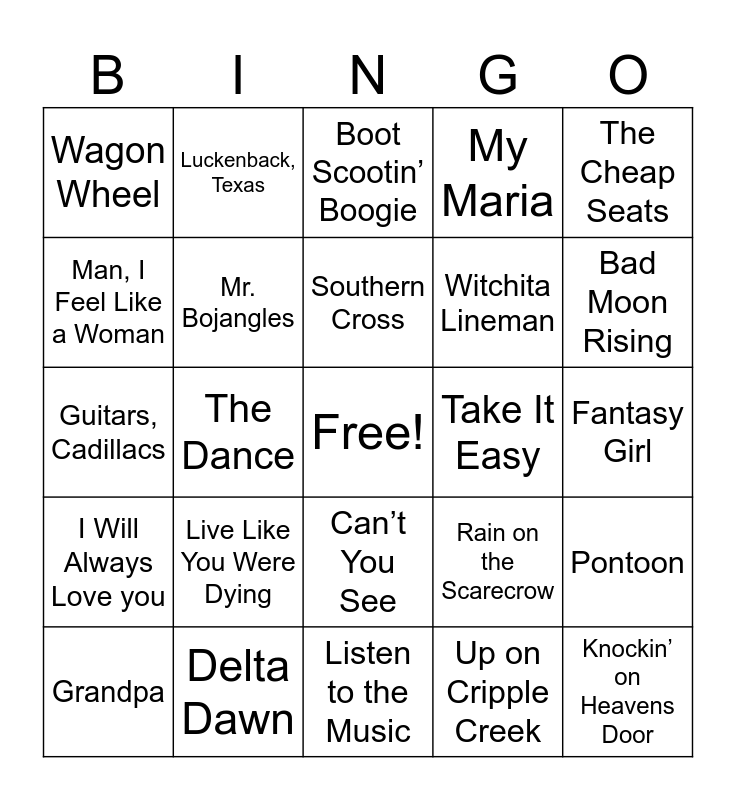 This bingo card has a free space and 50 words: Jackson, Knockin’ on Heavens Door, Life is a Highway, Listen to the Music, Live Like You Were Dying, Looking out my Back door, Luckenback, Texas, Mama Don’t Dance, Man, I Feel Like a Woman, Mountain Music, Mr. Bojangles, My Maria, Pontoon, Rain on the Scarecrow, Rocky Mountain HIgh, Save a Horse, Southern Cross, Take It Easy, Tennessee Whiskey, The Cheap Seats, The Dance, Up on Cripple Creek, Wagon Wheel, Witchita Lineman, Achy Breaky Heart, Amie, Bad Moon Rising, Before He Cheats, Boot Scootin’ Boogie, Can’t You See, Chattahoochee, Chicken Fried, Convoy, Copperhead Road, Delta Dawn, Dumas Walker, Falling in & out of Love, Family Tradition, Fancy, Fantasy Girl, Flirtin’ with Disaster, Gimme 3 Steps, God Blessed Texas, Good Hearted Woman, Grandpa, Guitars, Cadillacs, Harvest Moon, I Love this Bar, I Will Always Love you and Islands in the Stream.