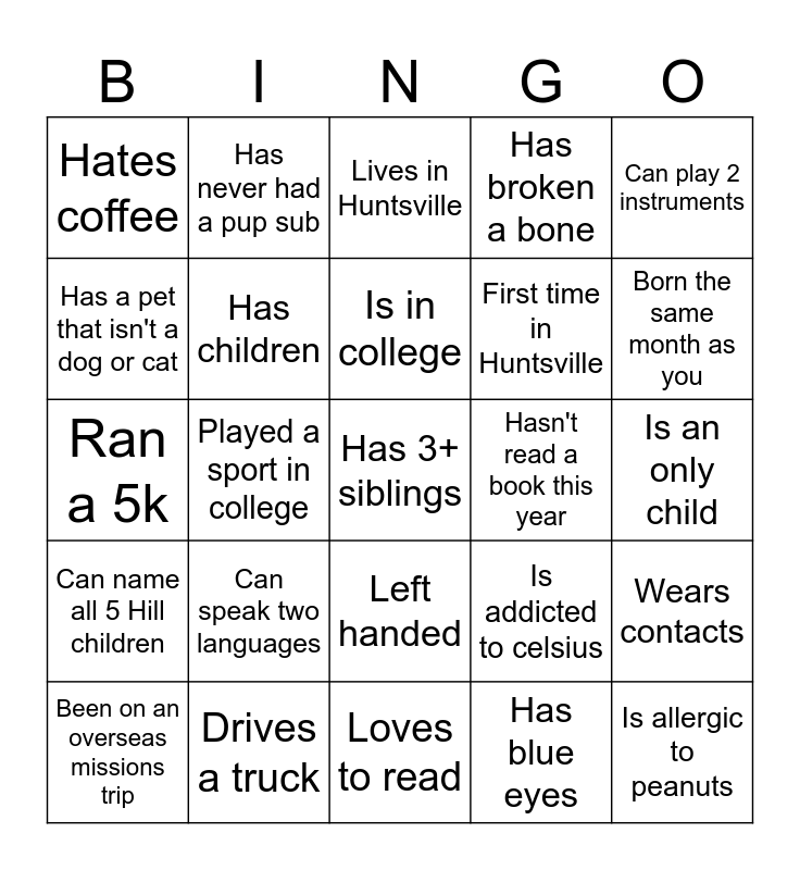 This bingo card has 25 words: Can speak two languages, Loves to read, Is in college, Been on an overseas missions trip, Can play 2 instruments, Hates coffee, Has a pet that isn't a dog or cat, Has never had a pup sub, Hasn't read a book this year, Left handed, First time in Huntsville, Ran a 5k, Is addicted to celsius, Wears contacts, Has children, Is allergic to peanuts, Is an only child, Lives in Huntsville, Born the same month as you, Played a sport in college, Has 3+ siblings, Drives a truck, Can name all 5 Hill children, Has broken a bone and Has blue eyes.