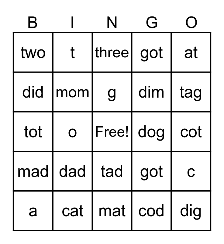 This bingo card has a free space and 29 words: a, i, o, one, two, three, mom, dad, dog, cat, cot, dig, mat, cod, tag, dot, tad, mad, at, tot, got, cam, dim, did, got, t, c, g and m.