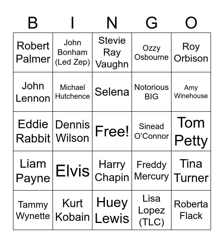 This bingo card has a free space and 58 words: Karen Carpenter, Kurt Kobain, Laura Branigan, Liam Payne, Lisa Lopez (TLC), Marvin Gaye, Michael Hutchence, Michael Jackson, Notorious BIG, Otis Redding, Ozzy Osbourne, Patsy Cline, Prince, Rick James, Ricky Nelson, Robert Palmer, Roberta Flack, Roy Orbison, Sam Cooke, Selena, Sinead O’Connor, Stevie Ray Vaughn, Tammy Wynette, Tina Turner, Toby Keith, Tom Petty, Tupac, Whitney Houston, Amy Winehouse, Andy Gibb, Bob Marley, Bon Scott (ACDC), Buddy Holly, Cass Elliott, Chris Cornell, Coolio, David Bowie, Dennis Wilson, Eddie Rabbit, Eddie Van Halen, Elvis, Eric Carmen, Freddy Mercury, George Harrison, George Michael, Glenn Campbell, Glenn Frey, Harry Chapin, Huey Lewis, Janice Joplin, Jim Croce, Jim Morrison, Jimi Hendrix, Jimmy Buffet, John Bonham (Led Zep), John Denver, John Lennon and Johnny Cash.