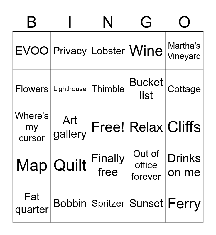 This bingo card has a free space and 24 words: Quilt, Bobbin, Thimble, Fat quarter, Martha's Vineyard, EVOO, Flowers, Privacy, Relax, Finally free, Bucket list, Where's my cursor, Out of office forever, Drinks on me, Lighthouse, Sunset, Cliffs, Lobster, Cottage, Art gallery, Ferry, Map, Wine and Spritzer.